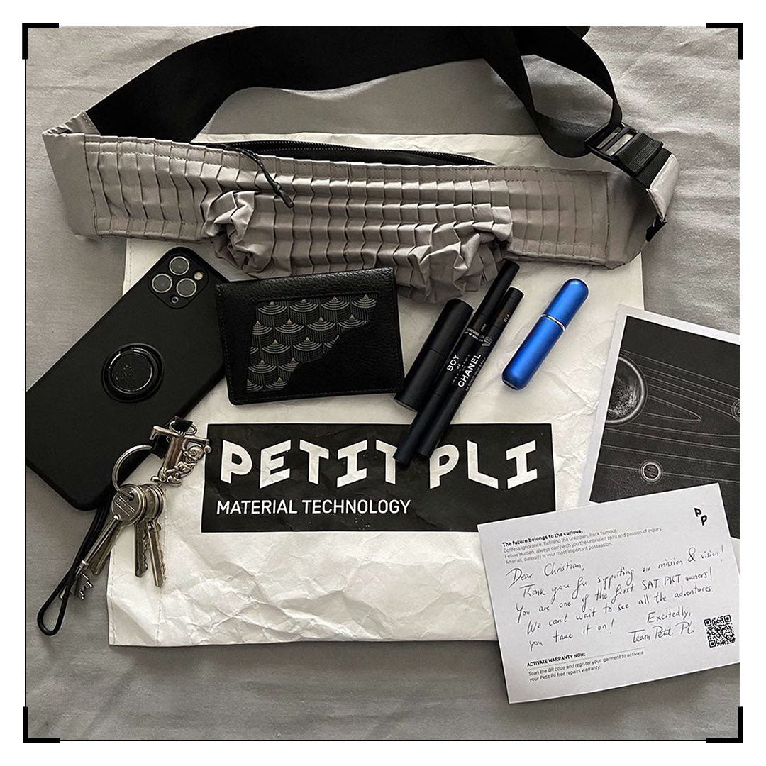 折りたたまれた構造は、まるで宇宙の衛星パネルのように広がり、収納スペースを柔軟に変化させます。ウエストポーチとして使用するのはもちろん、ストラップの長さを調整しクロスボディバッグとしてもお使いいただけます。